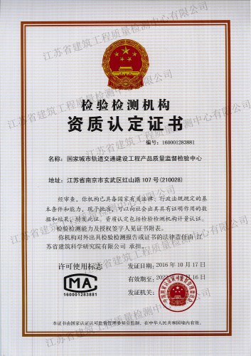 國家城市軌道交通建設(shè)工程產(chǎn)品質(zhì)量監(jiān)督檢驗中心, 依托江蘇省建筑科學(xué)研究院和江蘇省建筑工程質(zhì)量檢測中心在城市軌道交通建設(shè)工程領(lǐng)域的綜合技術(shù)優(yōu)勢,于2016年10月獲得國家認(rèn)證認(rèn)可監(jiān)督委員會批準(zhǔn)授權(quán)..